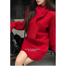 欧洲站2025冬季新款女潮时尚套头围巾宽松羊毛毛衣+针织短裙套装