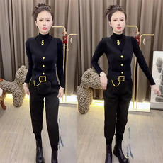 时尚气质名媛女士套装秋季新款假两件洋气上衣百搭哈伦裤两件套潮