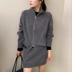 欧洲站2025冬装新款女潮时尚拉链高领羊毛毛衣开衫+针织短裙套装