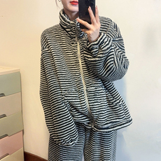 时尚潮流豹纹套装女秋冬新款立领侧条纹立领外套+高腰休闲裤两件