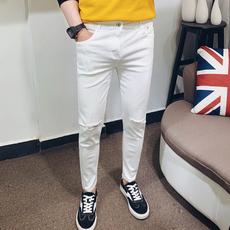 白色牛仔裤男夏季薄款修身小脚九分裤韩版潮流青少年新款破洞裤子