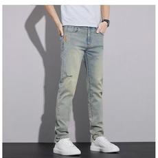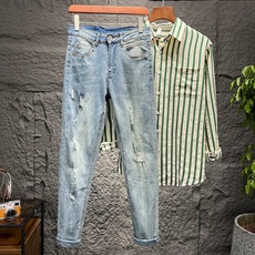 浅蓝色破洞牛仔裤男小直筒修身做旧小脚裤子2024秋冬季新款男士长