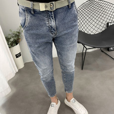 201猫须新款 潮修身男生铅笔裤修腿长裤牛仔裤子时尚蓝紧身小脚裤
