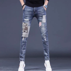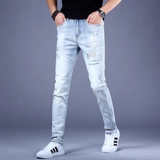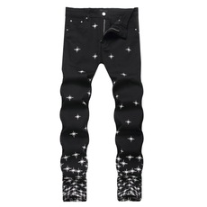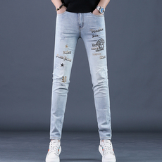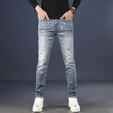 夏季新款印花高端牛仔裤男烫钻修身小脚裤欧货潮牌休闲弹力长裤子