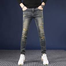 2025新款牛仔裤男花纹蓝色修身小脚弹力显瘦秋季高端男士青年裤子
