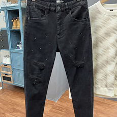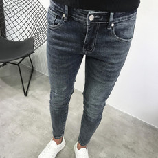 春秋季新款水洗黑色重工艺破洞刮烂乞丐裤修身拉链小脚裤牛仔裤男