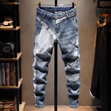 高端拼接牛仔裤男2025春秋季新款潮牌高街破洞水洗修身小脚长裤子