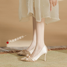 2025新款尖头细跟高跟鞋大码加肥加款蝴蝶结女单鞋婚鞋仙女风