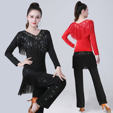 新款广场舞服装长袖亮片流苏套装拉丁舞演出比赛服摩登舞交谊舞服