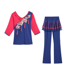 广场舞服装新款套装春夏中袖拼接舞蹈服上衣长裤刺绣花民族演出服
