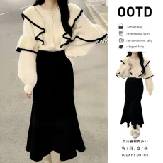 高品质现货秋季欧美风新款长袖翻领花边针织百搭鱼尾长款连衣裙