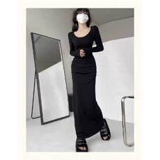 复古长袖修身显瘦鱼尾连衣裙2025新款内搭包臀打底弹力长裙