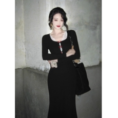 2025新款显瘦显高气质鱼尾裙女秋冬新款辣妹轻奢风修身黑色连衣裙