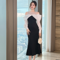 2025秋季新款女装钉钻重工拼接鱼尾显瘦优雅黑色时尚连衣裙ME5703