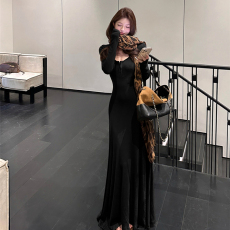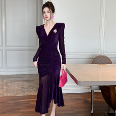 2025秋冬连衣裙女复古气质丝绒长袖修身鱼尾长裙新款礼服裙30995