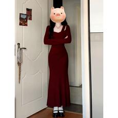 法式气质红色内搭打底鱼尾连衣裙子长裙女早秋2025新款修身包臀裙
