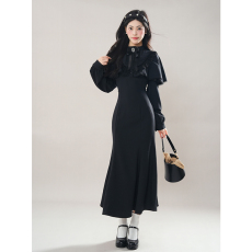 2025秋季新款小众法式鱼尾复古高腰修身显瘦灯笼袖连衣裙D3534
