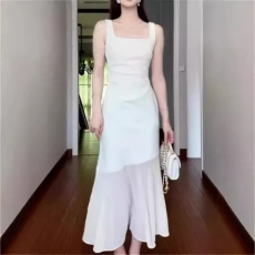 白色连衣裙子女春夏季2025新款今年流行爆款小个子收腰鱼尾中长裙