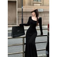 秋冬装新款女法式方领收腰显瘦过膝垂感黑色鱼尾连衣裙