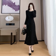 性感辣妹长袖针织连衣裙女早秋冬新款修身显瘦包臀裙鱼尾长裙