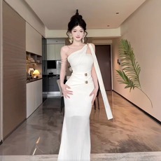 卡戴珊同款斜肩绑带吊带连衣裙2024夏季新款辣妹性感包臀鱼尾长裙