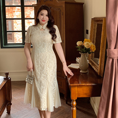 新中式复古改良版旗袍女夏季新款植绒烧花镂空修身鱼尾连衣裙长裙