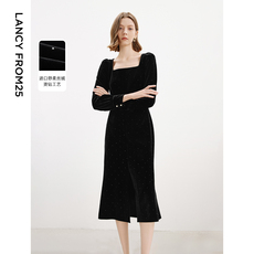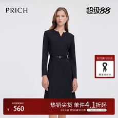 PRICH时尚小V领鱼尾连衣裙2025春季新款收腰长袖小黑裙女