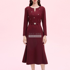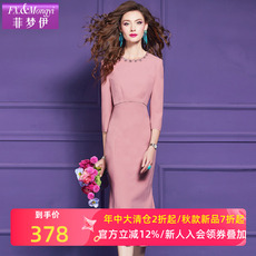 菲梦伊钉珠粉色连衣裙女长袖秋装新款高端优雅别致轻奢修身鱼尾裙