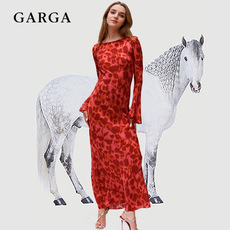 GARGA碎花绝美红色长袖连衣裙女2025秋季新款修身度假鱼尾裙长裙