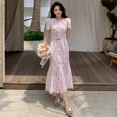 秋季新款女装蝴蝶装饰粉色蕾丝连衣裙高级修身显瘦气质鱼尾长裙子