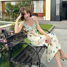 fifth 法式印花连衣裙女夏ffu新款撞色碎花吊带连衣裙收腰鱼尾裙