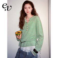 YBAI/亦白 25秋季新款时尚百搭领口花边条纹拼接假两件卫衣上衣女