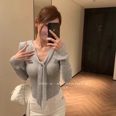 拉夏贝尔天丝羊毛半高领系结中袖收腰上衣女早秋高级感气质小衫