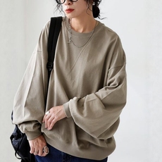 出口日本春季新款女士棉质圆领长袖T恤打底衫纯色宽松版