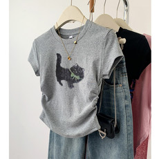 日本代购SLY 灰色猫咪正肩短袖t恤女夏季新款小个子修身短款上衣