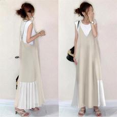 两件套装日系时尚宽松甜美杏色可调节百褶拼接吊带连衣裙+无袖T恤