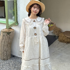 秋装新款女装日系甜美圆领水溶花边拼接长袖连衣裙棉麻长裙宽松