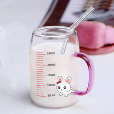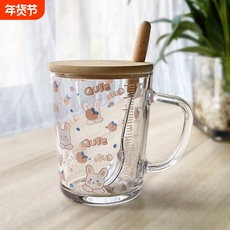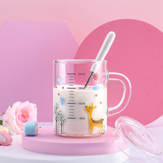 ins卡通玻璃杯刻度吸管牛奶早餐杯盖勺把手防烫耐热宿舍办公家用