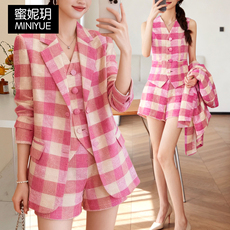 韩版明星同款复古格子西装外套女时尚显瘦名媛职业套装新款两件套