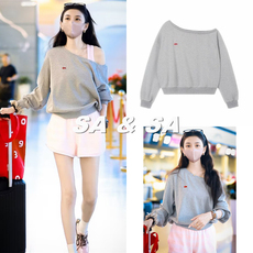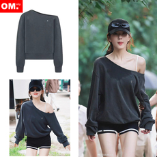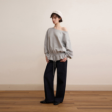 【明星同款】DKZ 灰色一字肩卫衣女秋季宽松通勤拼接抽绳下摆上衣