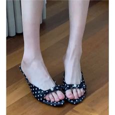 2025春夏新款蝴蝶结一字拖圆头小猫跟拖鞋外穿珍珠露趾高跟凉拖鞋