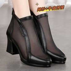2025春夏新款凉鞋女时尚粗跟网靴网纱高帮鞋真皮高跟妈妈鞋短靴女