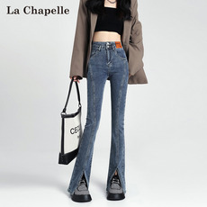 拉夏贝尔牛仔裤女春夏新款百搭时尚简约高腰前开叉微喇叭长裤子