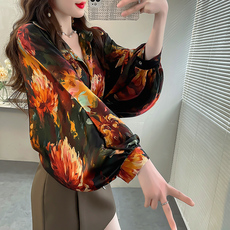 春季复古国风印花气质翻领雪纺衬衫上衣女大码中长款蝙蝠袖衬衣仙