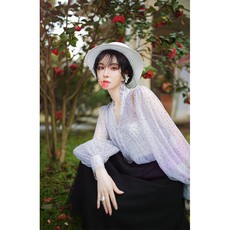 SOMSOM/索玛春季新品复古喇叭袖雪纺衫女法式浪漫蕾丝拼接上衣