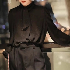 2026春季新款法式优雅亮片蝴蝶结飘带衬衣女设计感别致上衣雪纺衫