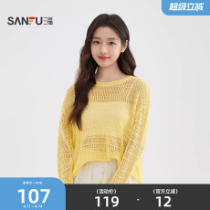 三福长袖T恤2026新款春季少女印花斜肩罩衫宽松休闲微透上衣女装