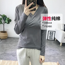 纯棉哺乳上衣春秋季长袖外出打底秋衣孕妇产后哺V乳衣睡衣月子服