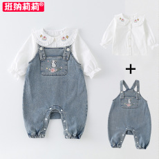 婴儿衣服套装背带裤连体衣女宝宝春秋软牛仔薄款秋季分体两件套潮