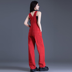 大红色牛仔背带裤女春秋2025新款网红减龄小个子工装阔腿裤连体裤